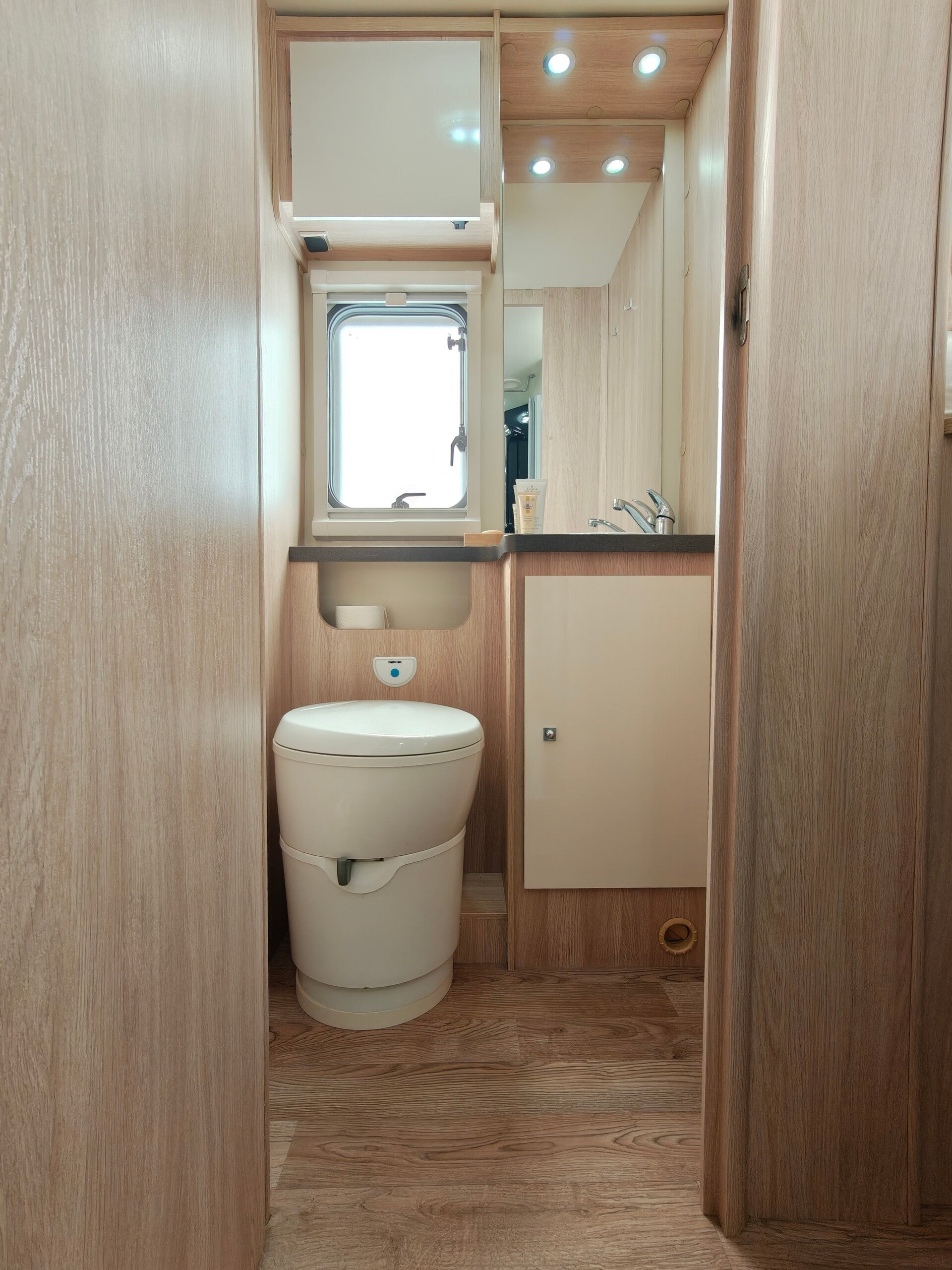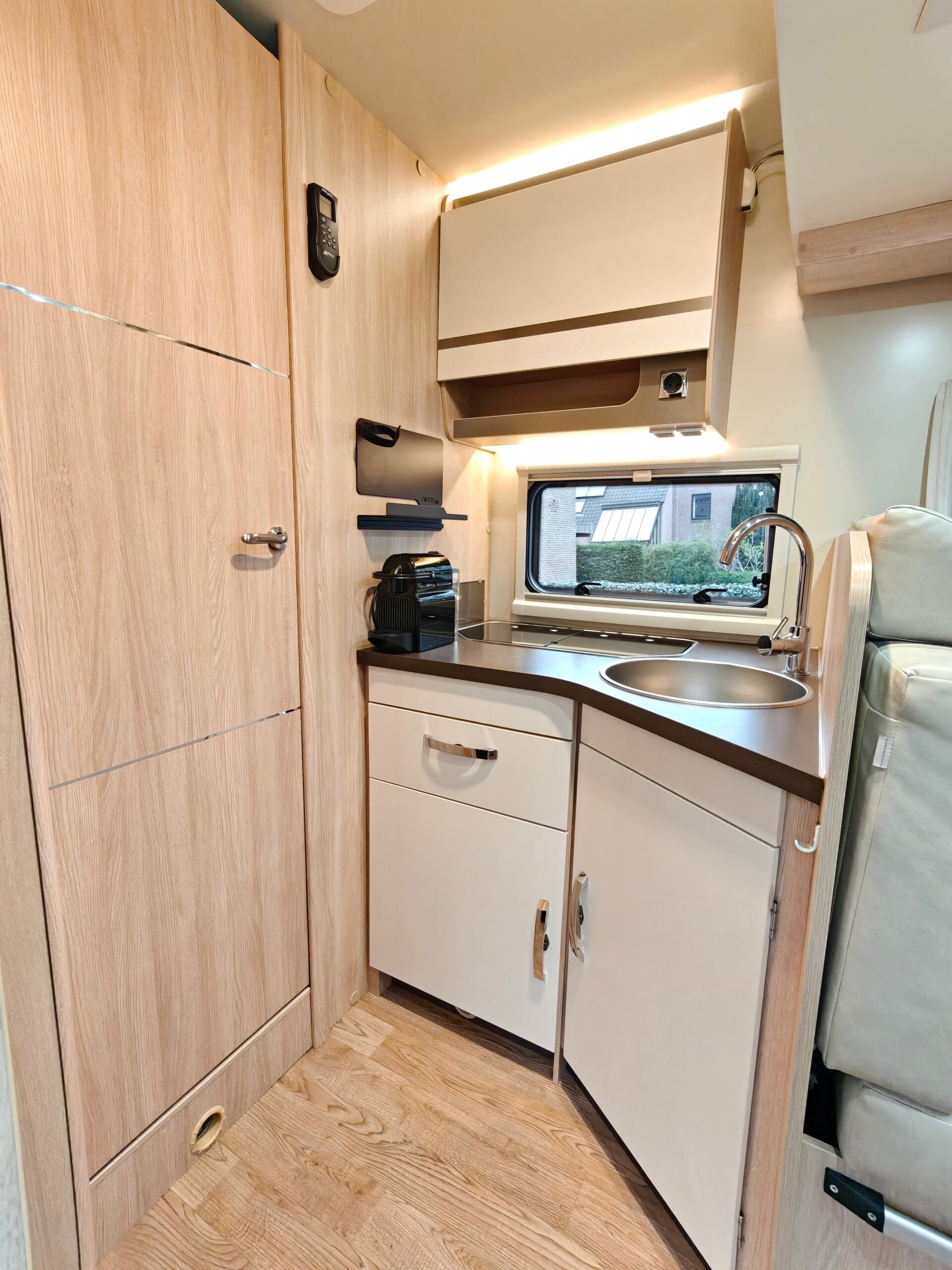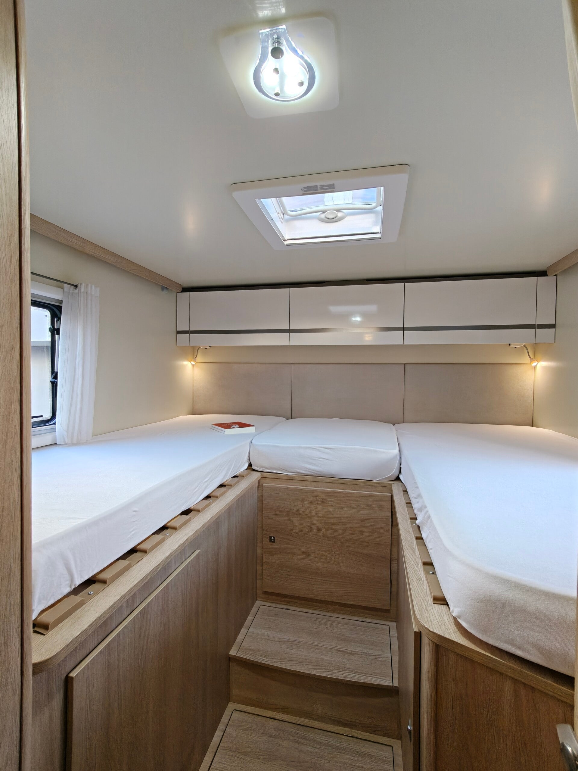 Wat onze camper zo fijn maakt, is de duidelijke scheiding tussen leefruimte vooraan en slaapruimte achteraan. Je kan het slaapgedeelte achteraan afsluiten met een deur.